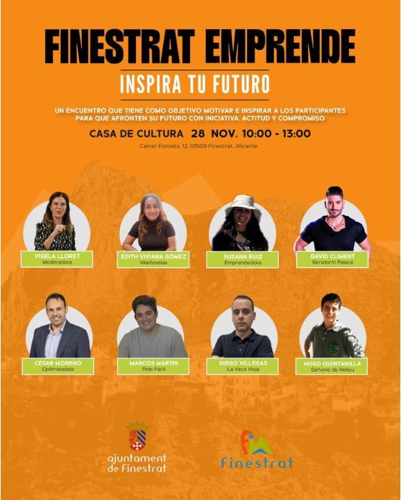 El viernes 28 de noviembre llega a la Casa de Cultura “FINESTRAT EMPRENDE”, una iniciativa de la Concejalía de Empleo y de Formación, también de la Concejalía de Empresa, dirigida a fomentar la cultura emprendedora y poner en valor el talento local.