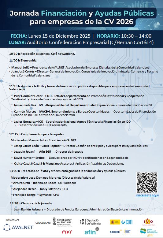 - Ayudas públicas: @CDTI_innovacion, Instituto Valenciano de Competitividad e Innovación IVACE +i (Generalitat Valenciana), INSTITUT VALENCIÀ DE FINANCES, ICO - Instituto de Crédito Oficial