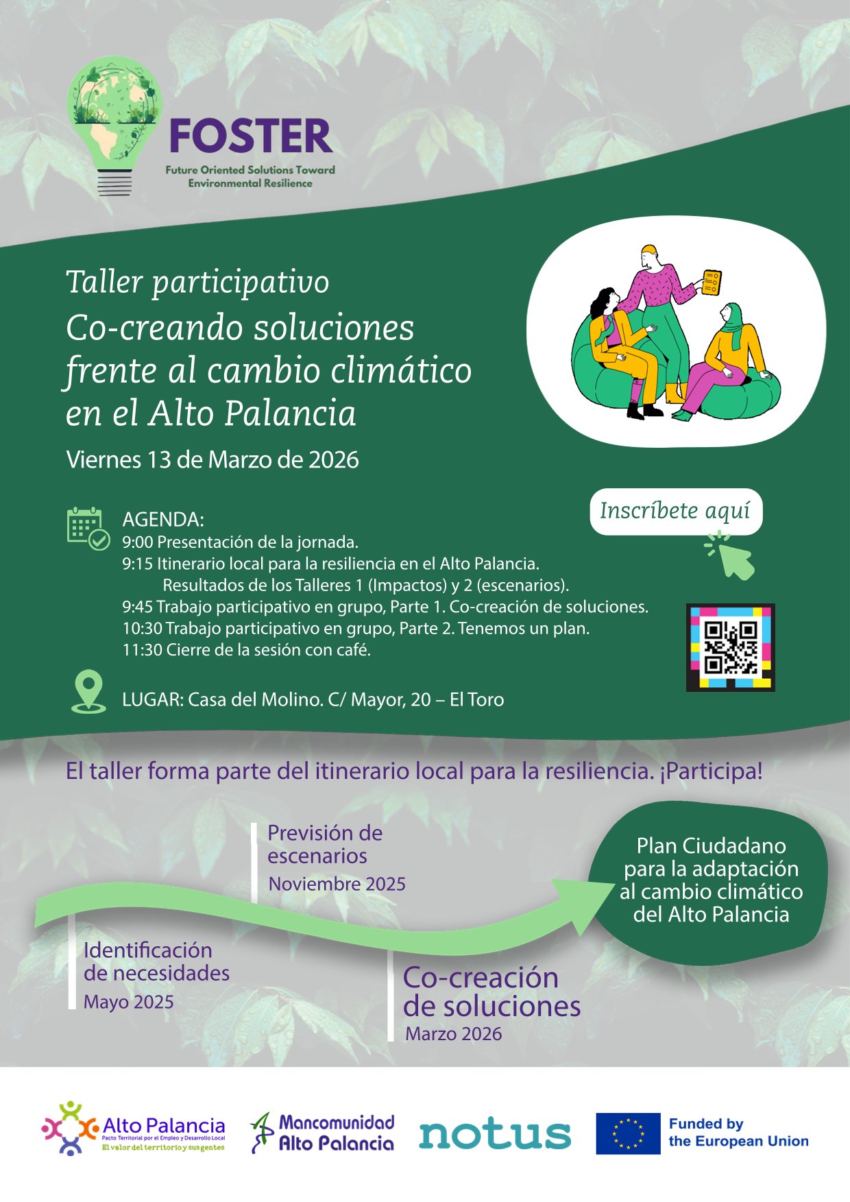 Desde el Pacto por el Empleo y Desarrollo Local Alto Palancia os invitamos a particiar en el Taller “Co-creando soluciones frente al cambio climático en el Alto Palancia”, que forma parte del itinerario local participativo del Proyecto FOSTER, cuyo objetivo final es la implicación efectiva de ciudadanía y agentes territoriales en la elaboración de un Plan Ciudadano para la adaptación al cambio climático de la comarca, con una visión de anticipación y bajo los principios de la democracia local.