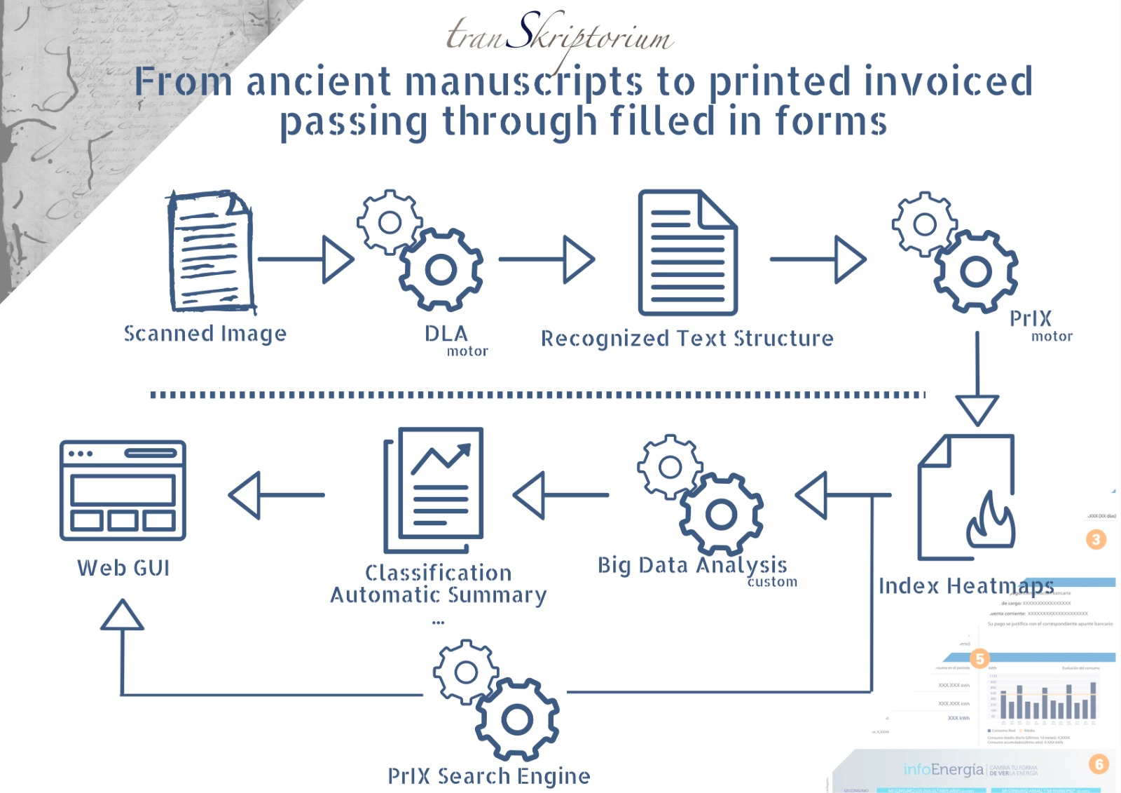 TransKriptorium, es una Spin-off de la Universitat Politècnica de València que ha desarrollado una tecnología de AI que es capaz de transcribir textos manuscritos de cualquier época, lengua, tipo de escritura y estructura en bases de datos digitales. Aplicando además técnicas de ML y Big Data se podrá obtener resultados de búsqueda y análisis de la información contenida en ellos, como si de textos electrónicos se tratara.