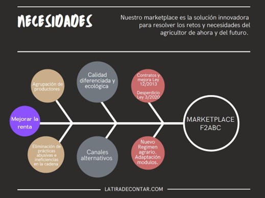 Nuestro proyecto de Marketplace va a mejorar la renta de los agricultores a través de una concentración de productores, eliminando las prácticas abusivas e ineficiencias de la cadena siendo un canal alternativo para la promoción de la calidad diferenciada y de la agricultura ecológica en un espacio digital donde se cumpla la ley de contratos de la cadena alimentaria agraria (ley 12/2013), la ley del desperdicio alimentario (ley 3/2020) y además estará adaptada a las futuras modificaciones del sistema especial agrario español, en donde la partes, agricultores, empresas, organismos públicos, clientes, y distribuidores puedan realizar transacciones de compra-venta en un Marketplace de “La granja a la mesa”