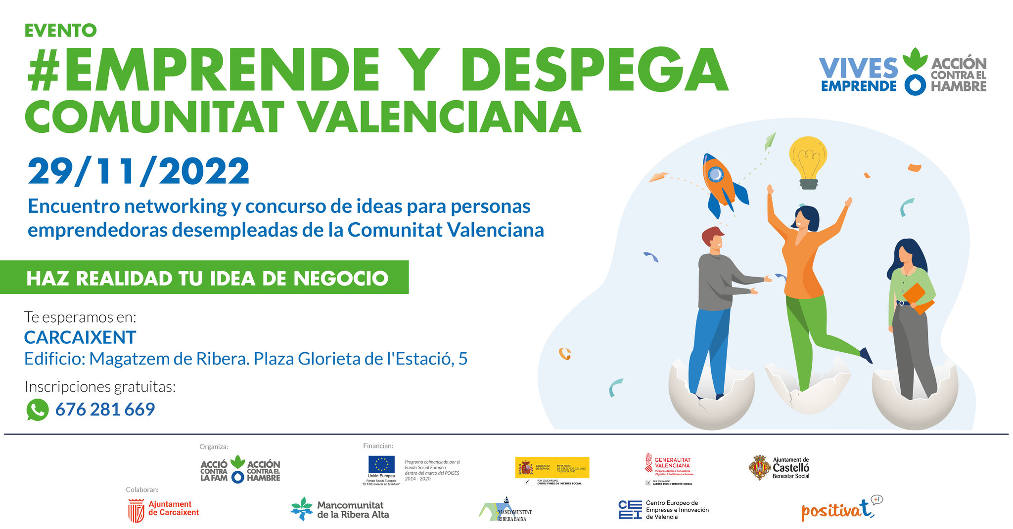 Este proyecto está financiado por el Fondo Social Europeo, el Ministerio de Derechos Sociales y Agenda 2030 del Gobierno de España (IRPF 2022), la Vicepresidencia primera y Conselleria de Igualdad y Políticas Inclusivas de la Generalitat Valenciana (IRPF 2022), y la concejalía de Bienestar Social del Ayuntamiento de Castelló de la Plana. Además, cuenta con la colaboración del Ayuntamiento de Carcaixent, las mancomunidades de la Ribera Alta y la Ribera Baixa, CEEI Valencia y la asociación POSITIVAT.