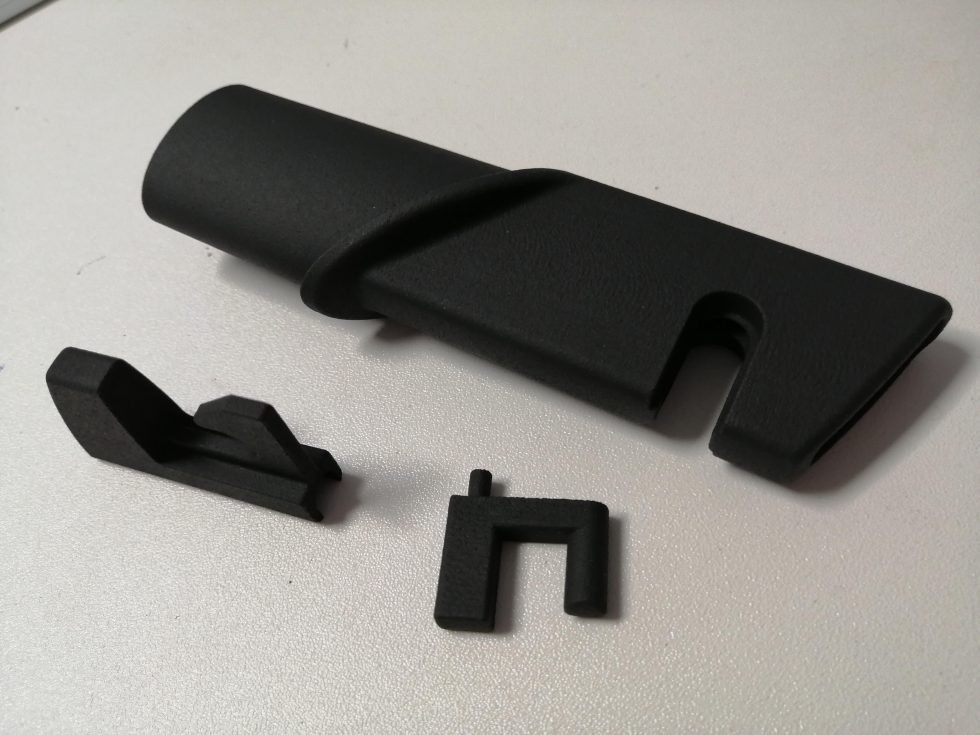 - Las piezas de nylon SLS son blancas y se pueden teñir en una multitud de colores. Los materiales SLS reforzados con grafito y carbono son naturalmente de color gris oscuro/negro uniforme. Las piezas MJF en su acabado "básico" natural tienen un aspecto gris mate. Se pueden teñir de negro. El granallado de las piezas en crudo es aconsejable