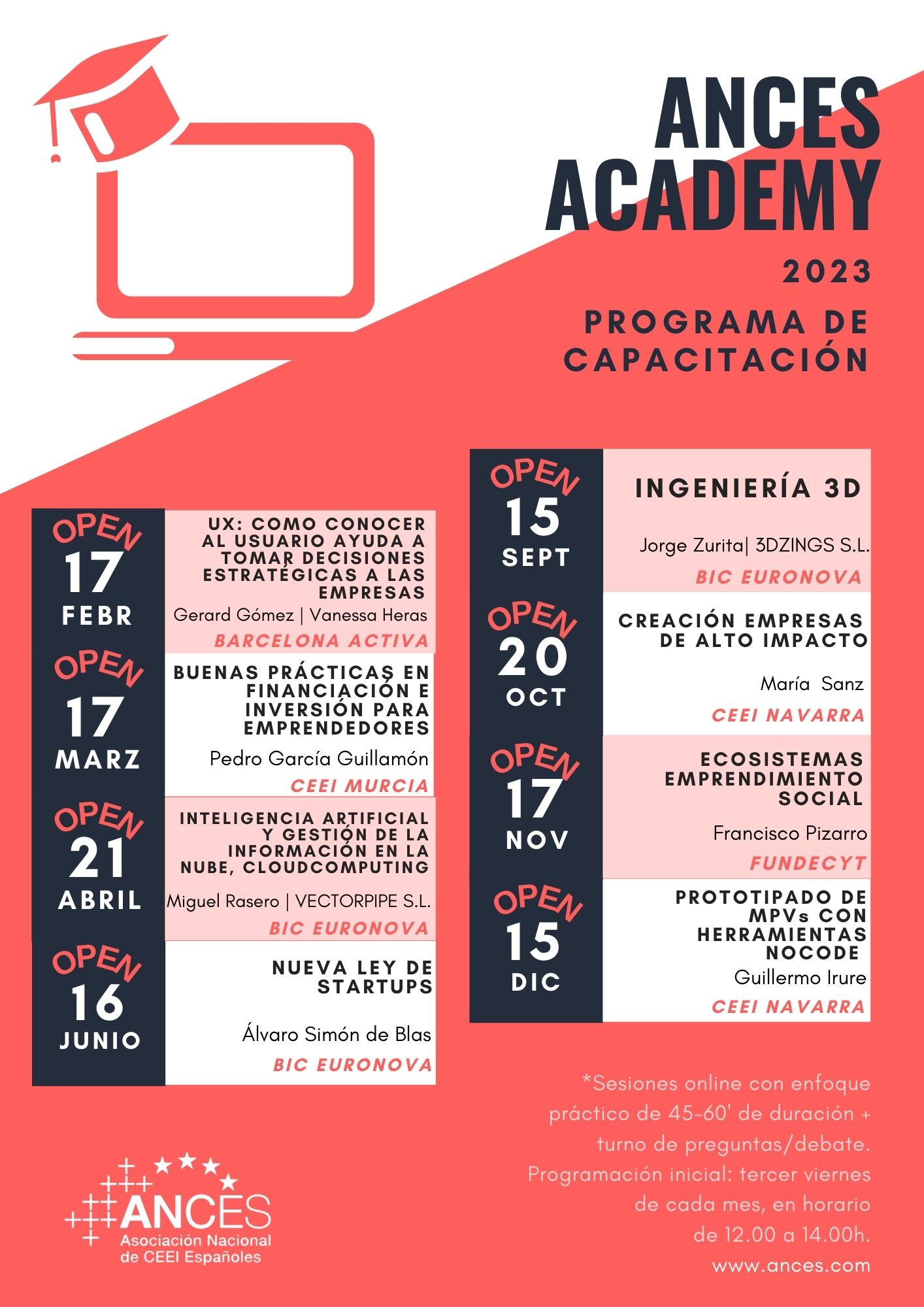 ANCES, la Asociación Nacional de CEEI Españoles, ha lanzado una nueva edición de su ANCES Academy, una serie de webinars mensuales con temáticas tan diversas como: inteligencia artificial, cloud computing, ley de startups, ingeniería 3D, crecaión de empresas de alto impacto, herramientas NO CODE o Ecosistemas de emprendimiento social.