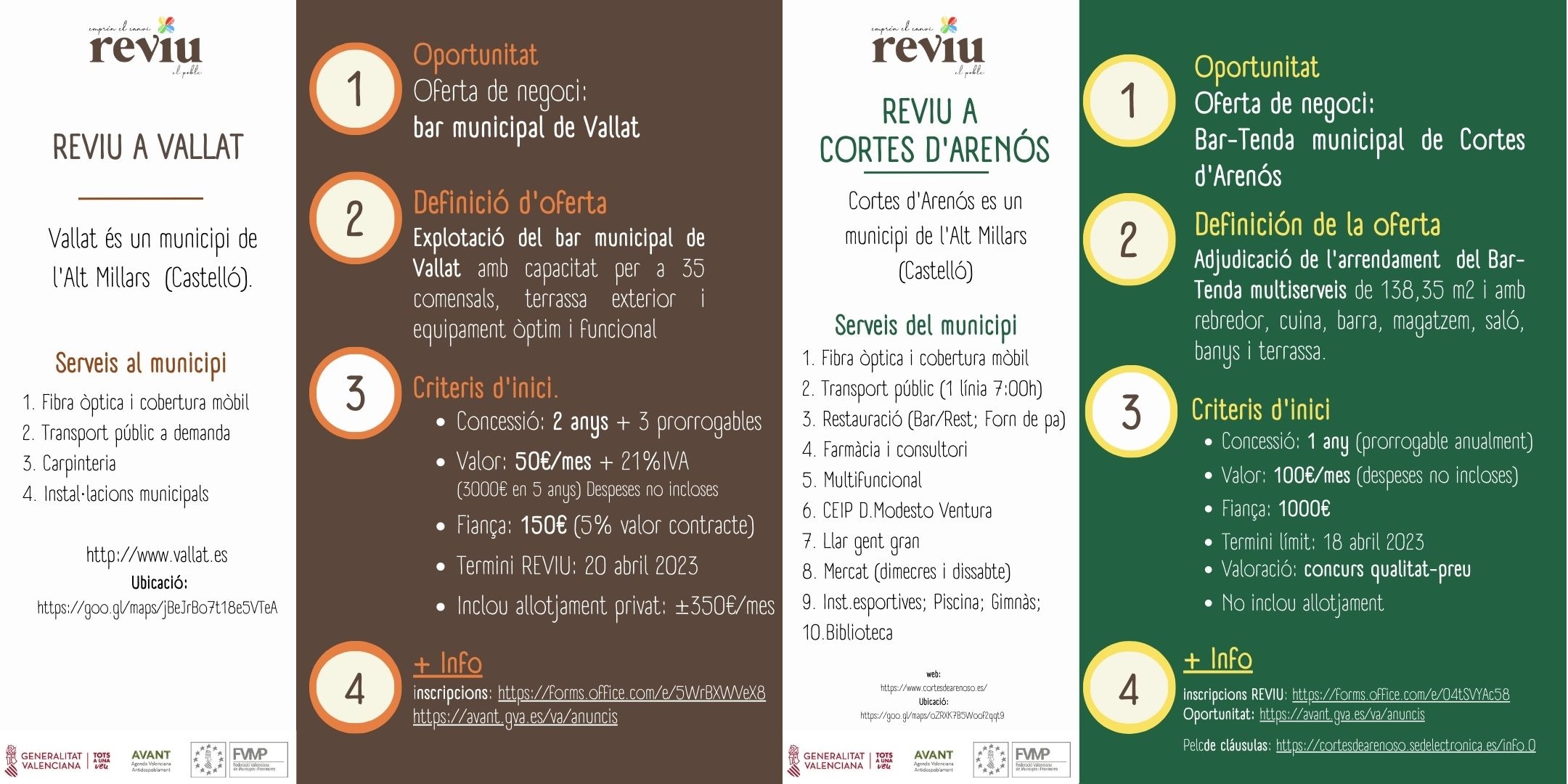 Los municipios de Vallat y Cortes de Arenoso, ambos en la comarca del Alto Mijares, licitan sus respectivos bares municipal y bar-tienda del municipio. Desde AVANT-FVMP derivamos y acompañamos familias/candidaturas para que puedan presentar ofertas a la Corporación local.