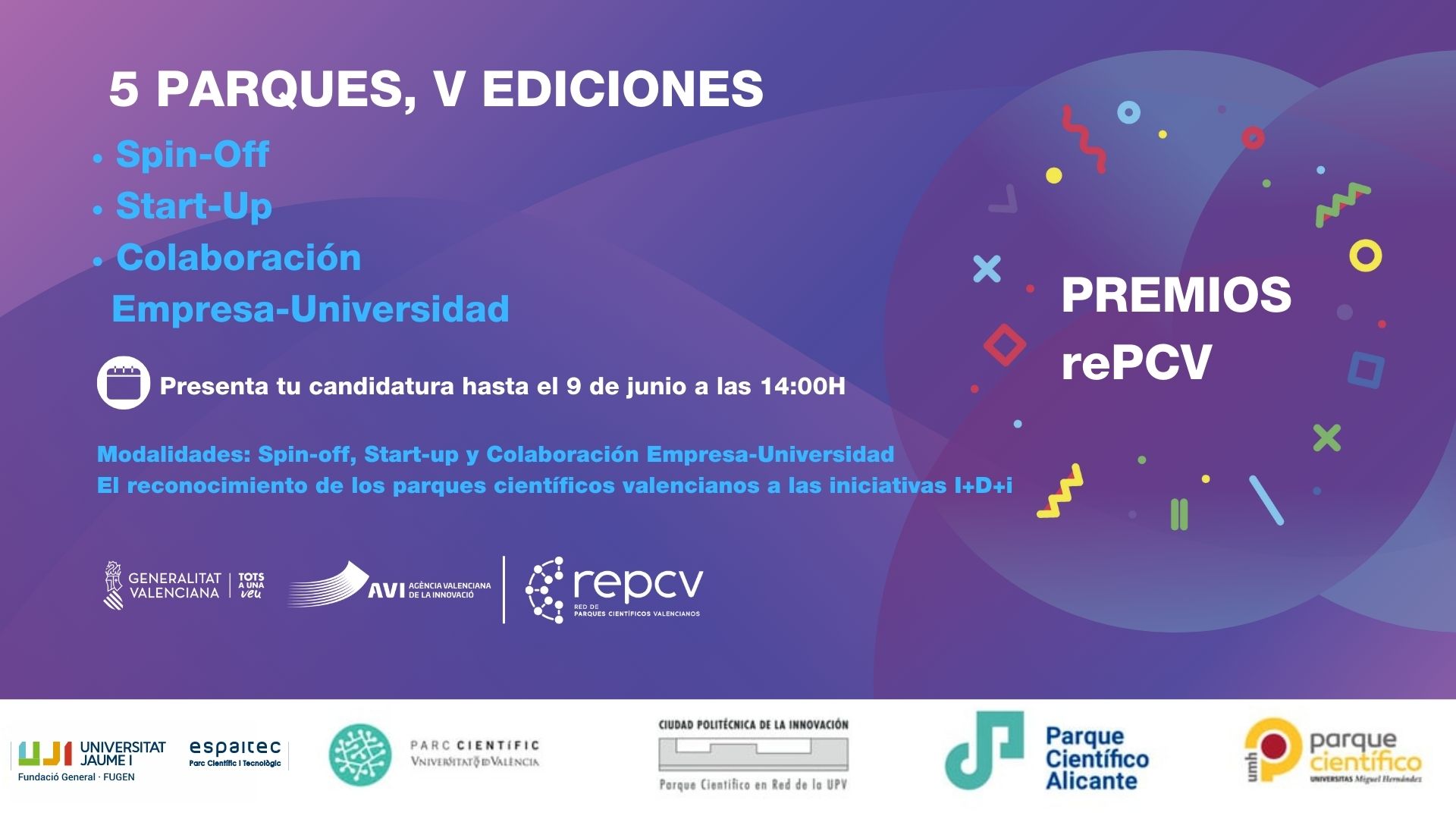 La Red de Parques Científicos Valencianos convoca la V edición de los Premios rePCV Reconocer y premiar la actividad de iniciativas emprendedoras y empresariales atendiendo a su crecimiento, carácter innovador, estrategia empresarial y aportación al entorno. Este es el objetivo de los premios que organiza por quinto año consecutivo la Red de Parques Científicos Valencianos (rePCV), de la que forma parte el Parc Científic de la Universitat de València (PCUV), entidad que este año organiza los premios. La iniciativa cuenta con el apoyo de la Agencia Valenciana de la Innovación (AVI). Las empresas interesadas en participar (no pueden hacerlo si han sido premiadas en ediciones anteriores) pueden enviar su solicitud hasta el 9 de junio.