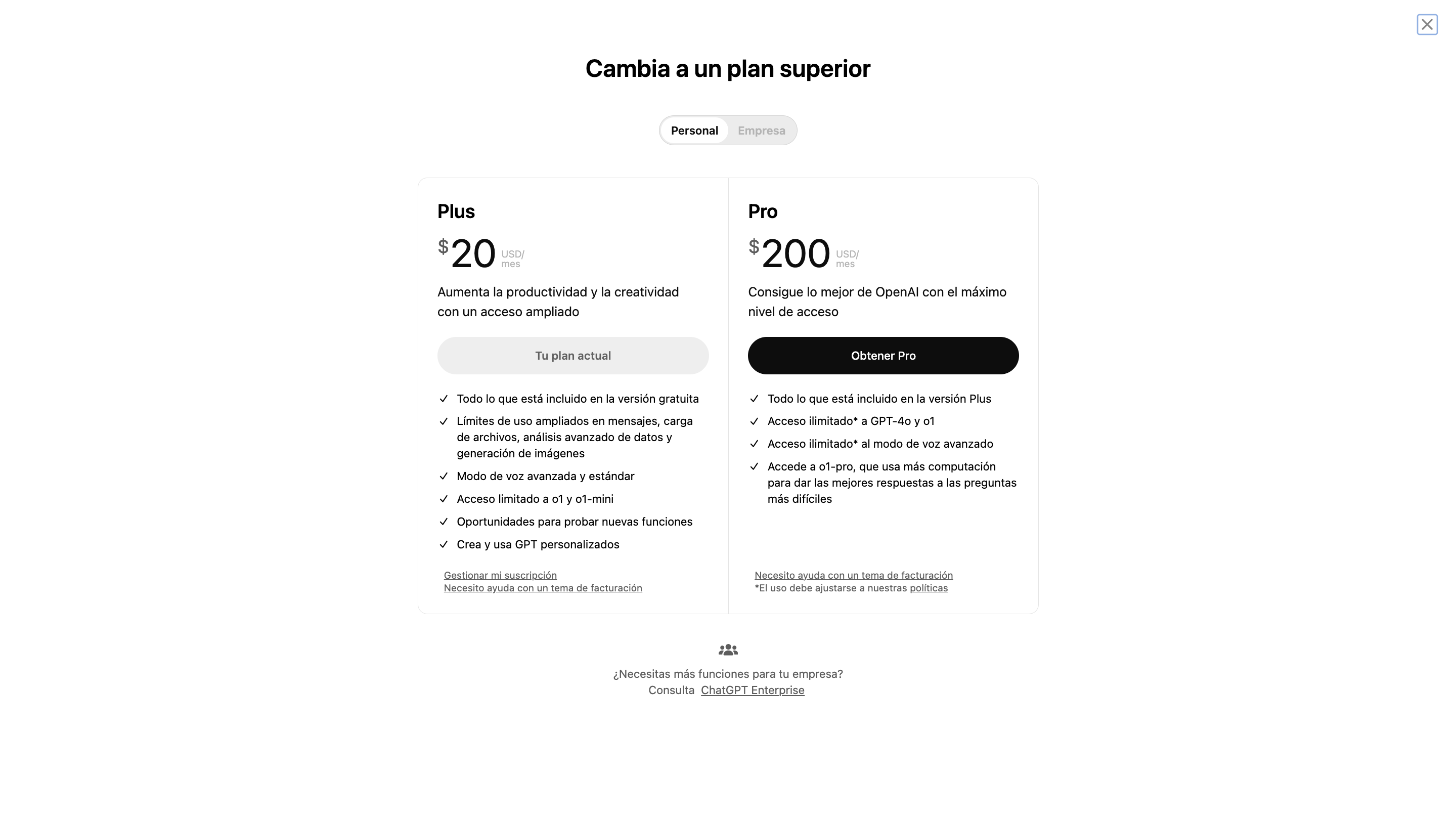 Pro Acceso ilimitado a o1, GPT-4o y funcionalidades avanzadas. Acceso ilimitado al modo de voz avanzado. Acceso a o1-pro. $200/mes