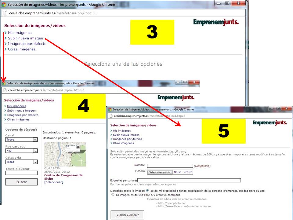 ----- Subir una nueva imagen (5): no se dispone de una imágen adecuada, y se quiere subir una nueva. En este caso, en la parte superior derecha dirá "carga una nueva imágen". Entonces se selecciona la imágen de nuestro ordenador, se selecciona la imágen del cuadro de diálogo y entonces actualizando la página se actualizará la imágen.