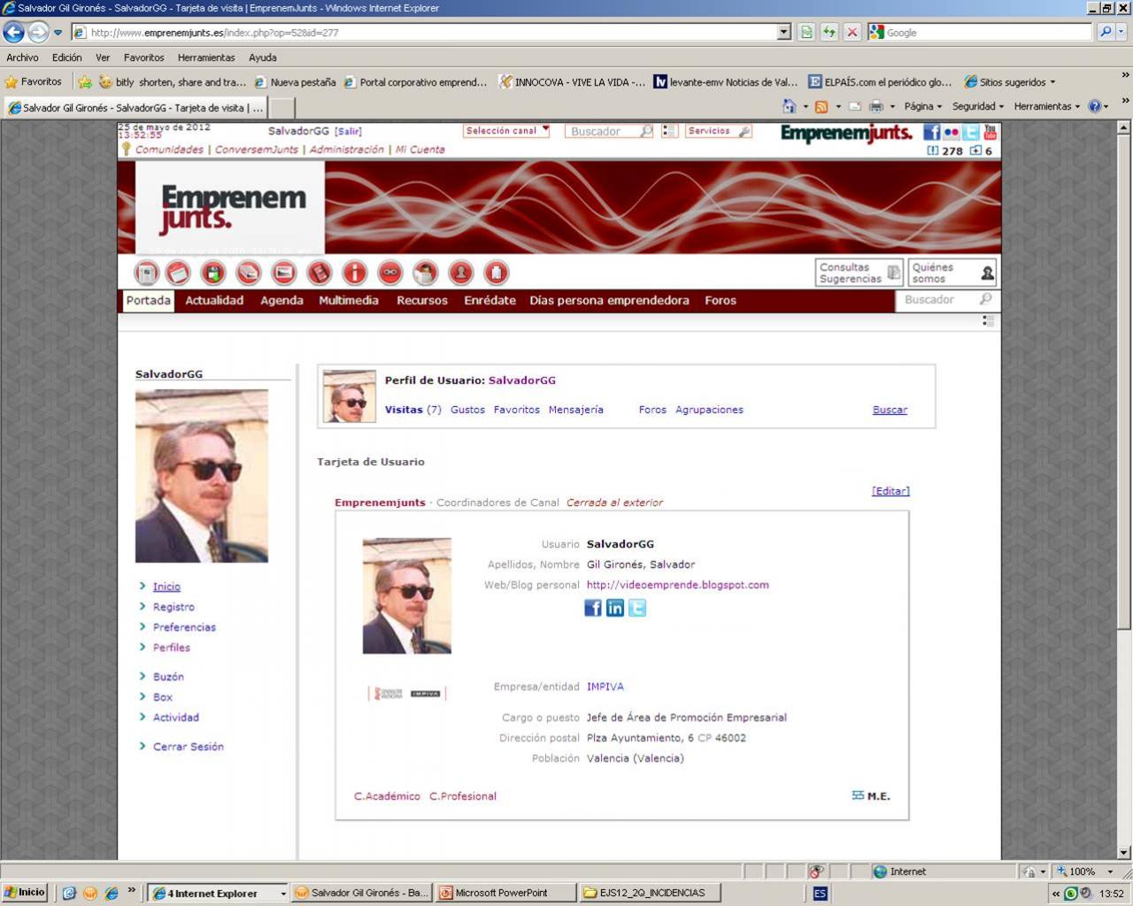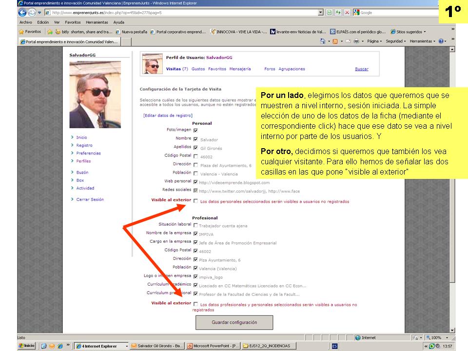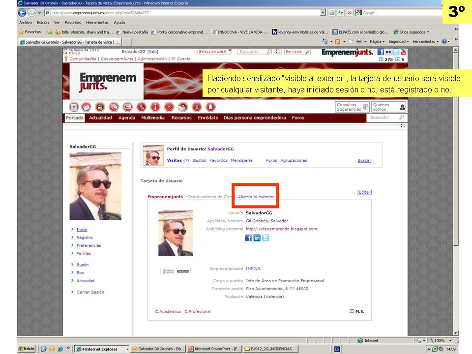 3º.- Activar la tarjeta de usuario es cumplimentar los campos de la tarjeta, clickar sobre la mayoría de ellos y por supuesto que sea "visible al exterior". La activación de la tarjeta le dará al usuario visibilidad en internet y podrá ser buscado y encontrado a través de los buscadores.