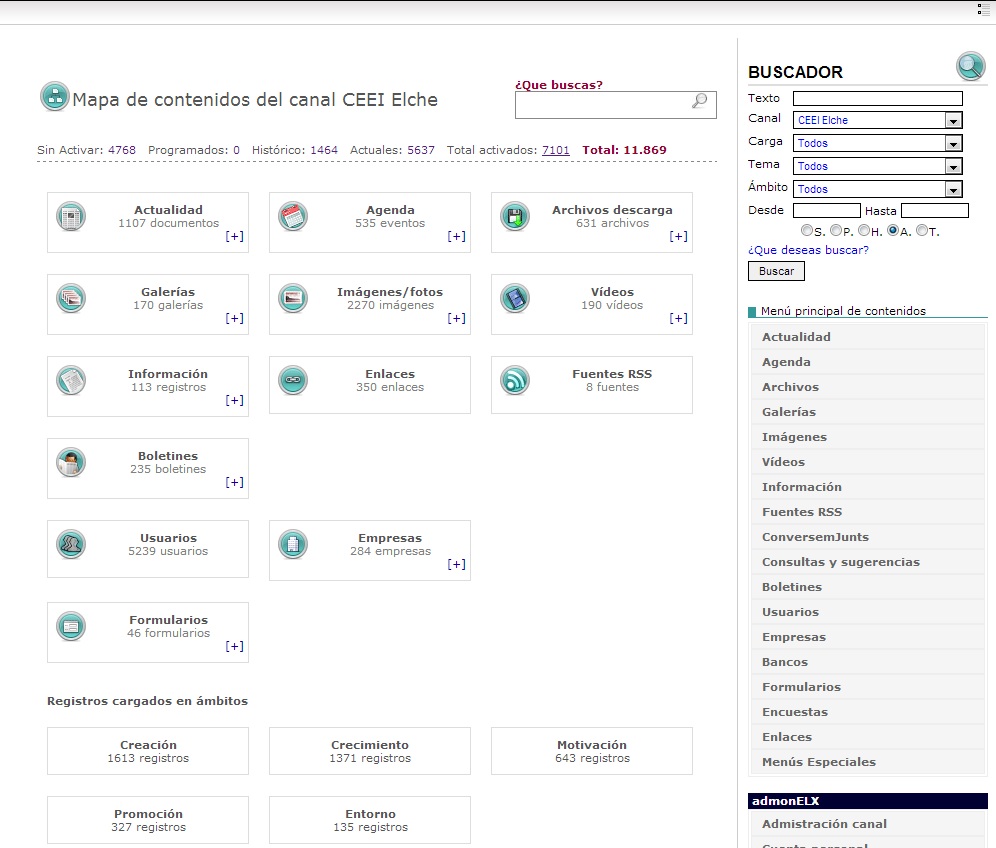 Si ampliamos la segunda imagen, en este caso ubicada en el lateral derecho, encontramos lo que llamamos "mapa de contenidos", y, en él, vemos que todas las categorías-fichas de contenidos, hay un signo más ( + ), pinchando sobre ése signo + abrimos la correspondiente ficha para cargar contenidos.