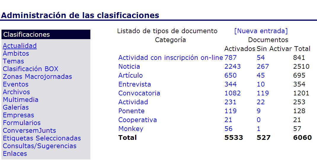 - Fichas: Actualidad, Eventos, Archivos, Multimedia, Galerías, Enlaces, Foros y Consultas/sugerencias