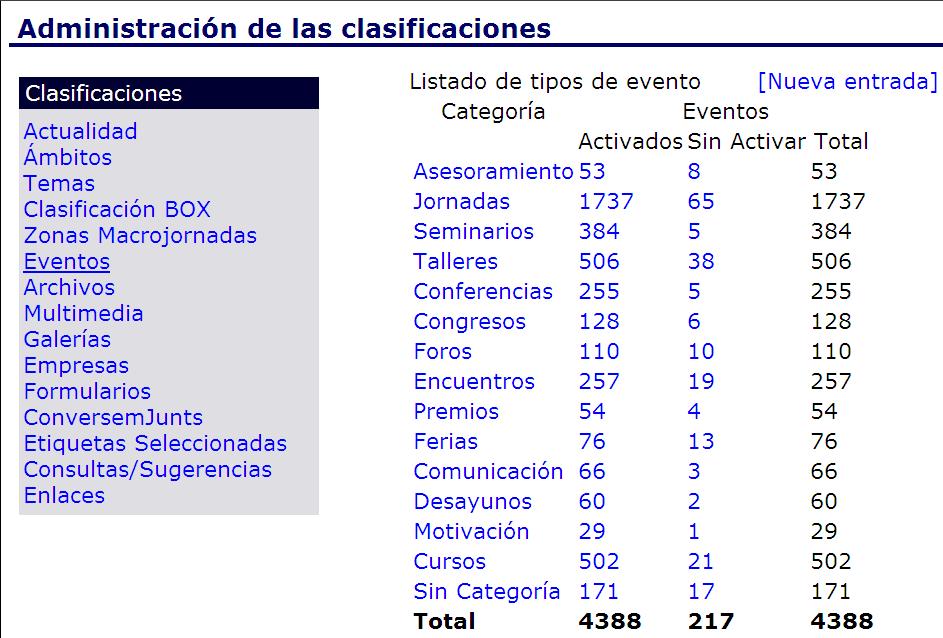 - Fichas: Actualidad, Eventos, Archivos, Multimedia, Galerías, Enlaces, Foros y Consultas/sugerencias