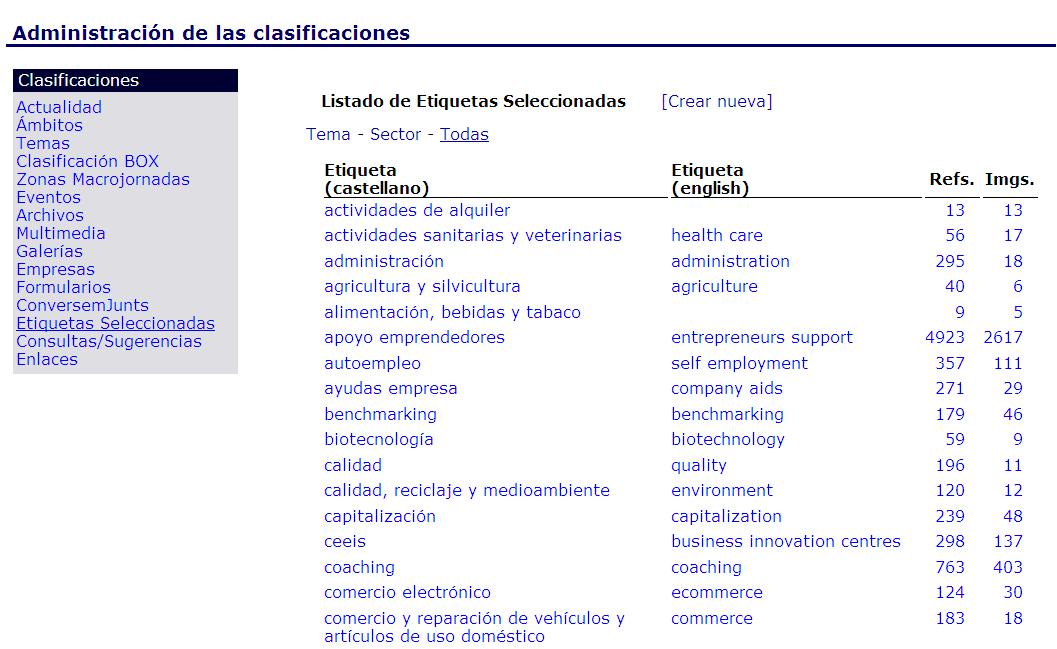 El portal emprenemjunts, actualmente, cuenta con un conjunto de 102 etiquetas y dispone de una utilidad que permite asignar varias de ellas a cada registro, cualquiera que sea su tipo.