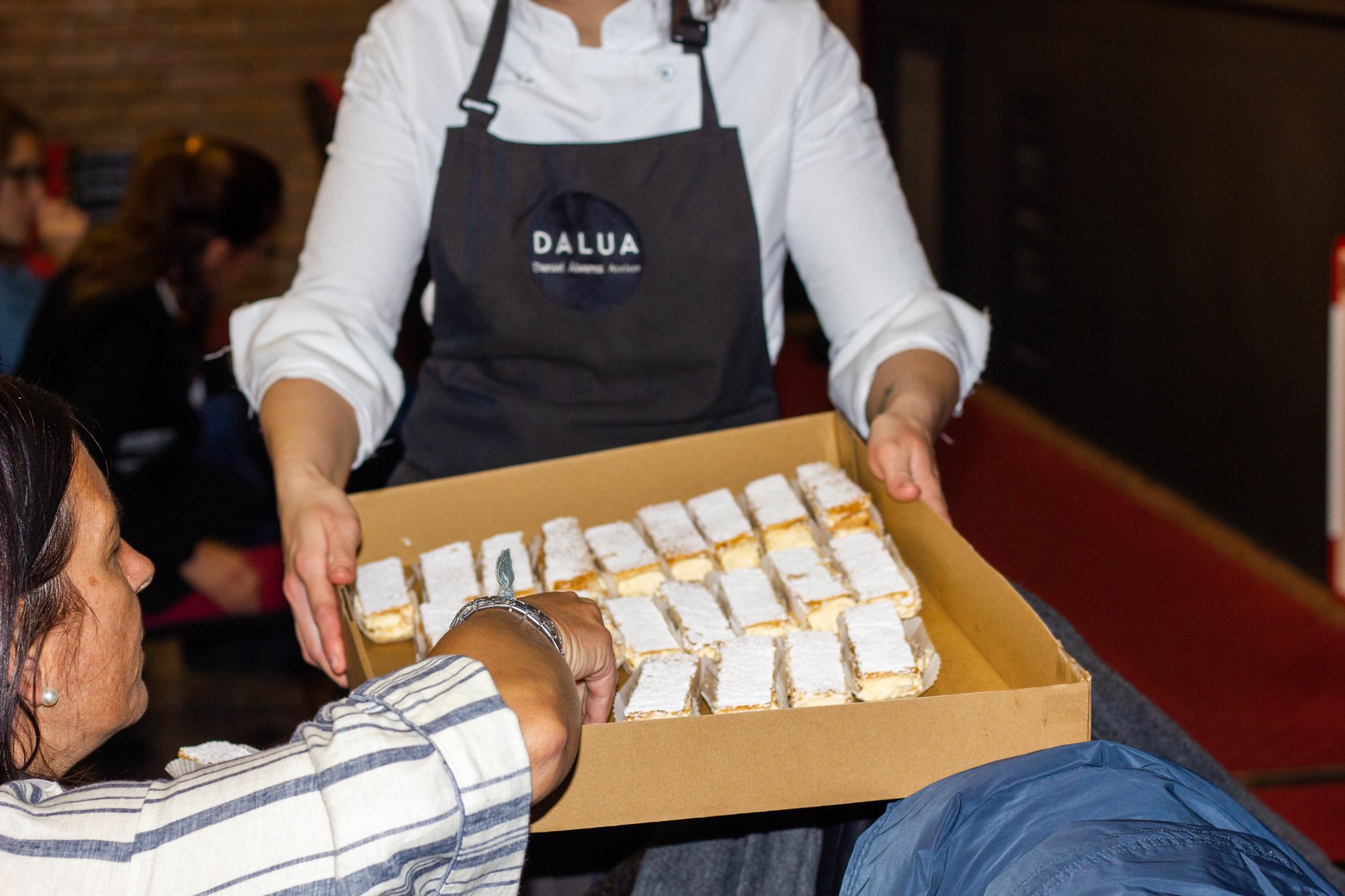 Miembros de su equipo, repartiendo las milhojas realizadas en directo entre los asistentes