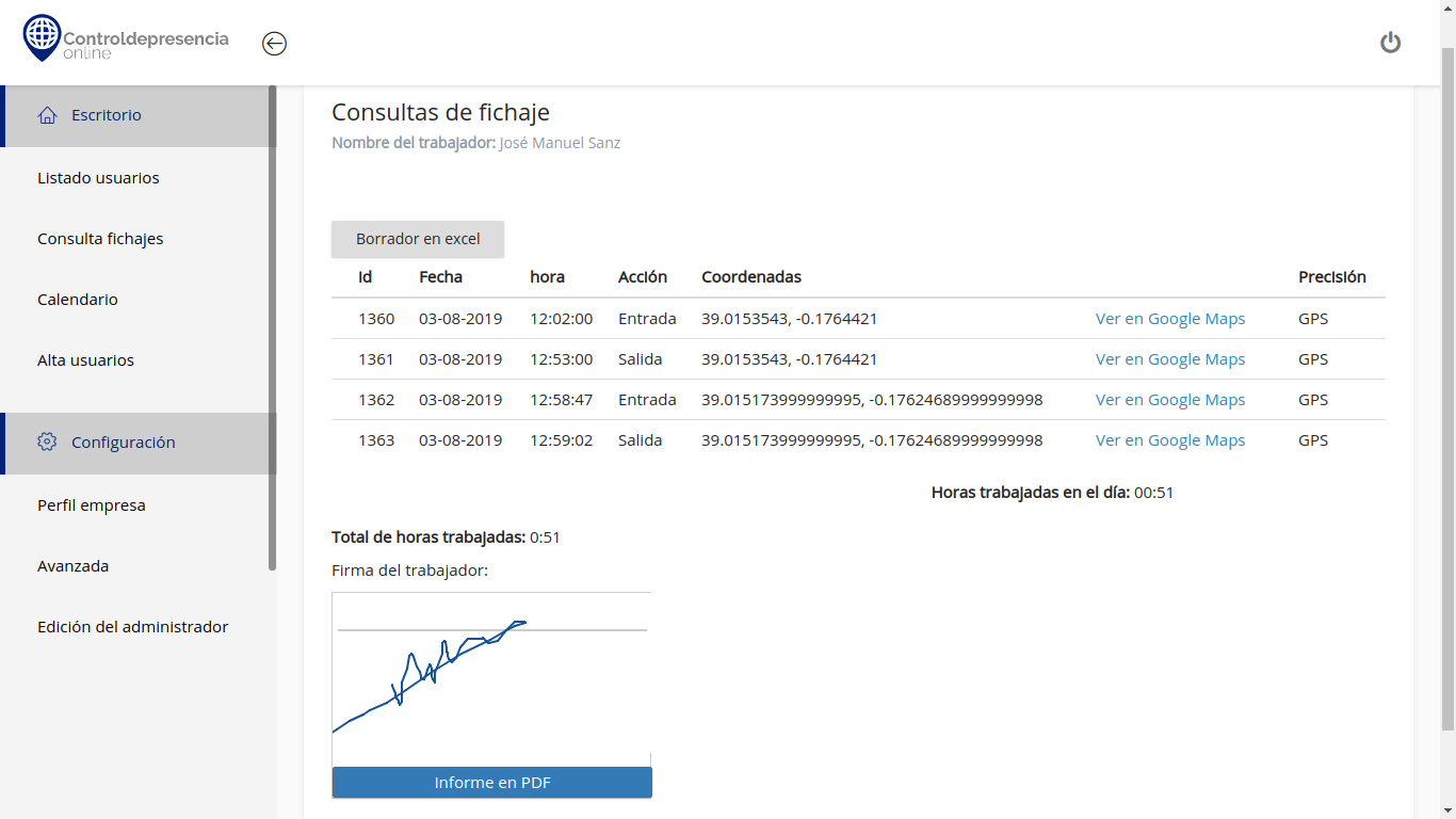 La gestión se puede llevar a cabo desde cualquier dispositivo con acceso a Internet y permite, en función de las características seleccionadas, geolocalizar los fichajes del personal (siempre bajo su conocimiento o consentimiento) y permite ubicar al usuario, en el momento del fichado, en una zona geográfica determinada.