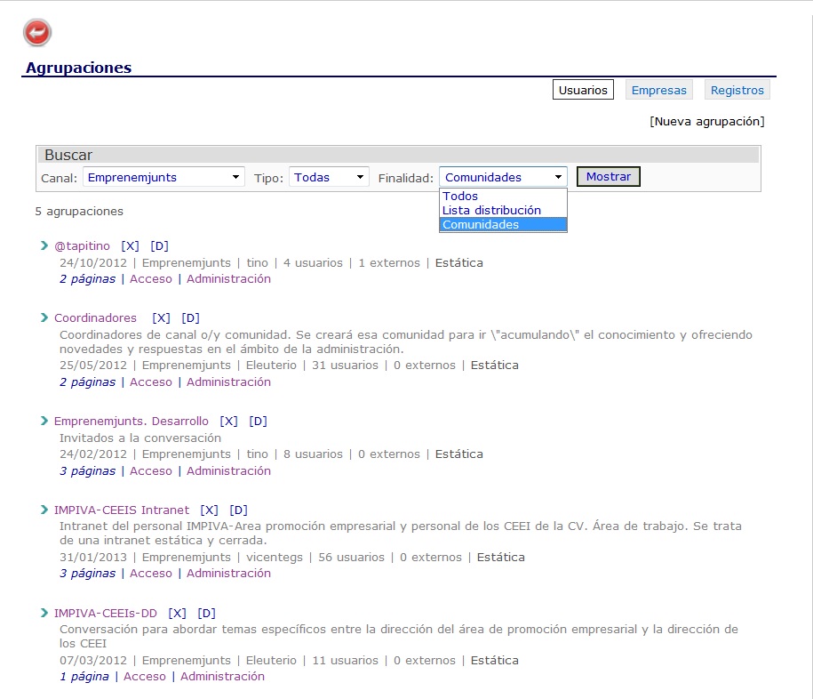 Como se aprecia en la imagen adjunta en la parte superior de la página el listado de comunidades forma parte del listado de agrupaciones. El listado de comunidades se obtiene del listado de agrupaciones especificando finalidad "comunidades".