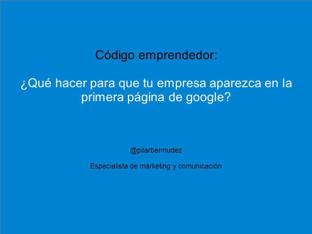 La exposición de la ponencia se realizó el 11 de noviembre de 2014 en CEEI Elche durante la jornada Código Emprendedor ¿Qué hacer para que tu empresa aparezca en la primera página de google?