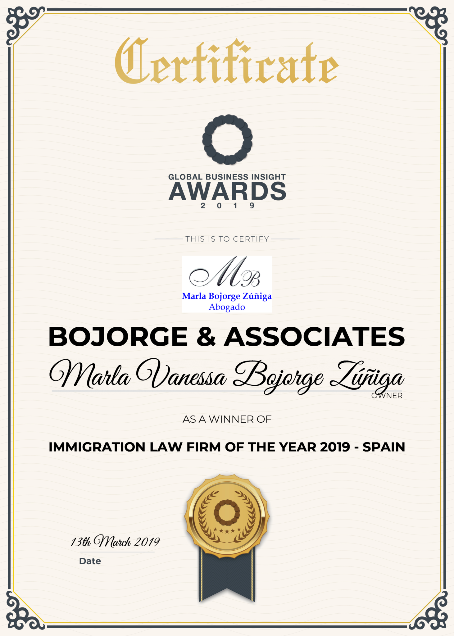 Certificado de reconocimiento,  Bojorge & Associates "Immigration Law Firm of the Year 2019 in Spain", Global Business Insight A[;;;][;;;]